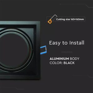 Supporto Porta faretto quadrato da incasso in plastica colore nero per 1 lampadina. Anello orientabile di 90° su 2 assi. Dimensioni: 175 x 175 mm.