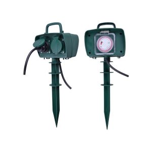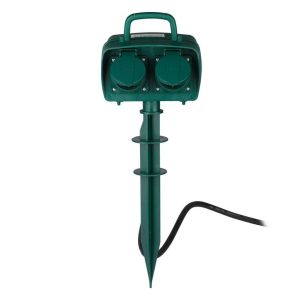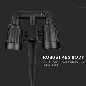 Portalampada per 2 Lampadine E27 con picchetto. Si raccomanda l’uso con Lampadine LED PAR38 IP65. Grado di impermeabilità IP44. Ideale per l’illuminazione a terra di piante e giardini. Diametro di ogni testa: 60mm