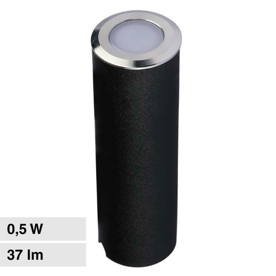 Segnapasso da interramento con potenza di 0,5W e tecnologia LED SMD. Realizzato in materiale plastico di colore alluminio. Fascio luminoso di 180° e flusso luminoso di 37 lm. Rapporto di 74 lm/W. Grado di protezione IP67. Luce Bianca Calda 3000K. Dimensioni: Ø26x82mm.