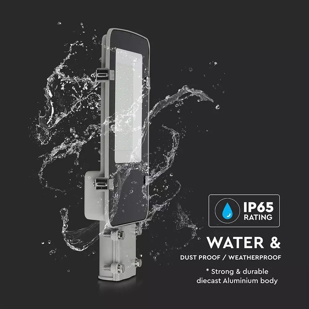 V-Tac Pro VT-100ST è una lampada LED per l’illuminazione stradale con potenza di 100W, tecnologia LED Samsung SMD, corpo in alluminio pressofuso di colore grigio con pannello frontale nero e copertura della sorgente luminosa trasparente. Con fascio luminoso di 110° e flusso luminoso di 9400 lm, questo lampione ha un rapporto di 94 lm/W. È dotato di cavi a saldare per la connessione alla rete elettrica e di un attacco con viti incluse per pali fino a 60mm di diametro. Ha un grado di protezione IP65 che lo rende ideale per un uso esterno, anche sotto la pioggia prolungata. Inoltre, il suo driver incorporato garantisce sempre elevata efficienza e consumi ridotti.