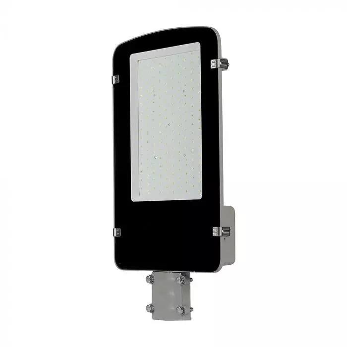 Street light LED con potenza di 100W, fascio luminoso di 110° e flusso luminoso di 9400 lm. LED Samsung SMD e rapporto di 94 lm/W. Corpo in alluminio di colore grigio con pannello frontale nero e copertura trasparente IP65 per uso esterno. Luce Bianca Fredda 6500K