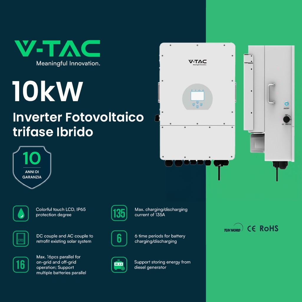 L’Inverter Ibrido V-TAC SKU 11542, Trifase 10kW Doppio MPPT, di cui MPPT1 con doppia stringa e MPPT2 con singola stringa, è un dispositivo elettronico che permette di convertire la corrente continua fornita dai pannelli solari fotovoltaici in corrente alternata, con uscita trifase adatta per il consumo di condomini, locali commerciali o industriali. Questo inverter ha lo Smart Meter integrato per la misurazione della corrente: non necessita di un ulteriore Smart Meter.