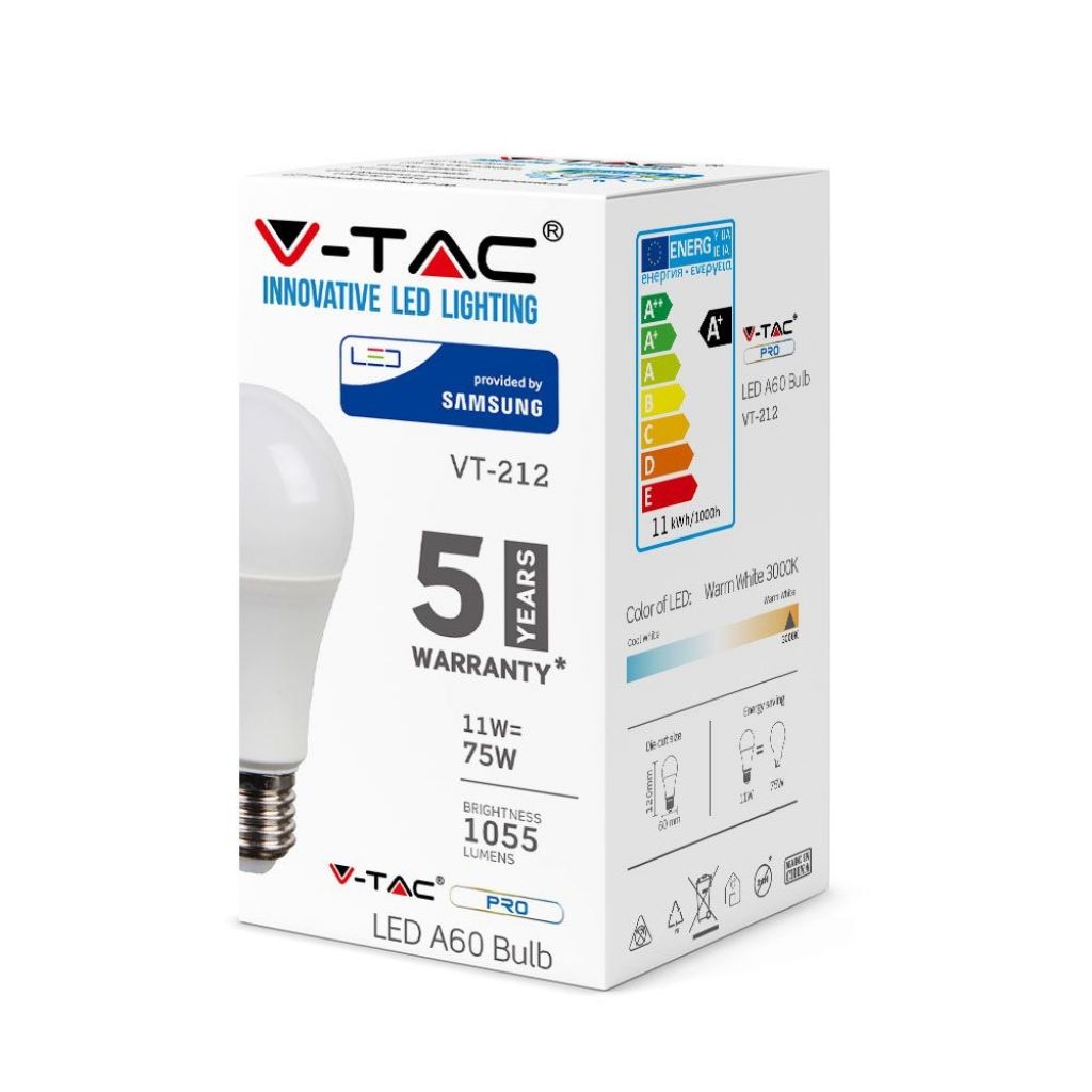Di seguito maggiori informazioni sul prodotto V-TAC con SKU 233, categoria Lampadine – E27: Lampadina LED V-TAC PRO VT-212 dotata di una potenza di 11W e attacco E27. Lampadina con tecnologia LED SMD con chip Samsung, Forma Bulb A60 in materiale termoplastico e copertura opaca. Questo prodotto dispone di un fascio luminoso di 200°, flusso luminoso di 1055 lm e un rapporto di 95 lm/W. La potenza di 11W è equivalente a 75W di una Lampadina a incandescenza.
