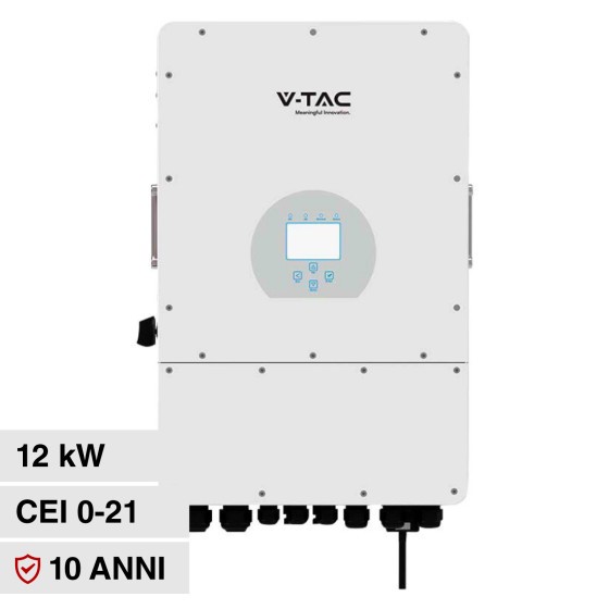 Inverter ibrido On-Grid / Off-Grid Potenza di 12kW e connettore standard RS485. Pannello di controllo con display LCD  IP65  Sistema trifase ad alta efficienza MPPT (99,9%). Certificato di conformità CEI 0-21.  connettori MC4, 3 trasformatori CT e Modulo Wi-Fi.
