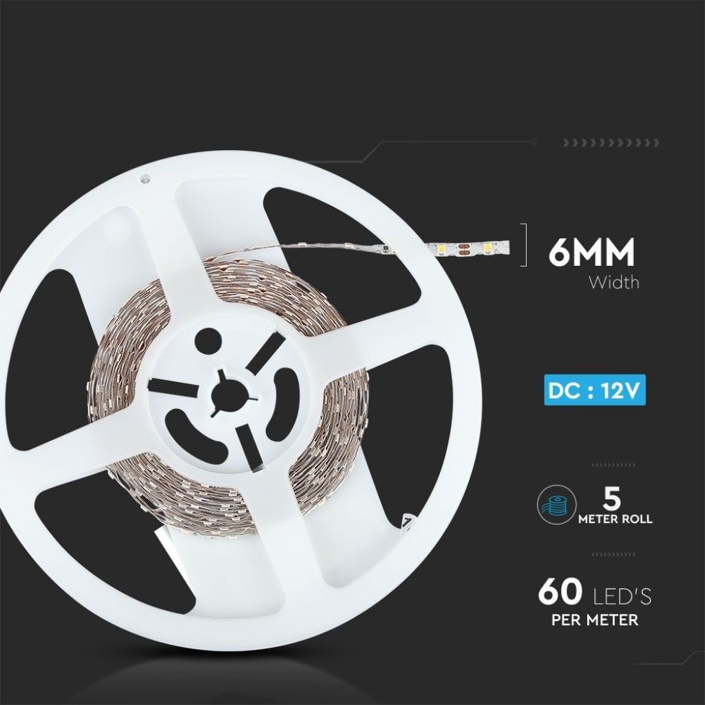 Striscia LED SMD2835 monocolore con potenza totale di 21W. Lunghezza bobina: 5m, sezionabile ogni 55mm. 60 LED per metro e potenza di 4,2W/m. di 420lm/m (2100lm totali). Alta luminosità e rapporto di 100 lm/W. Luce Bianca Calda Naturale 4000K (LxH): 5×1,3mm.