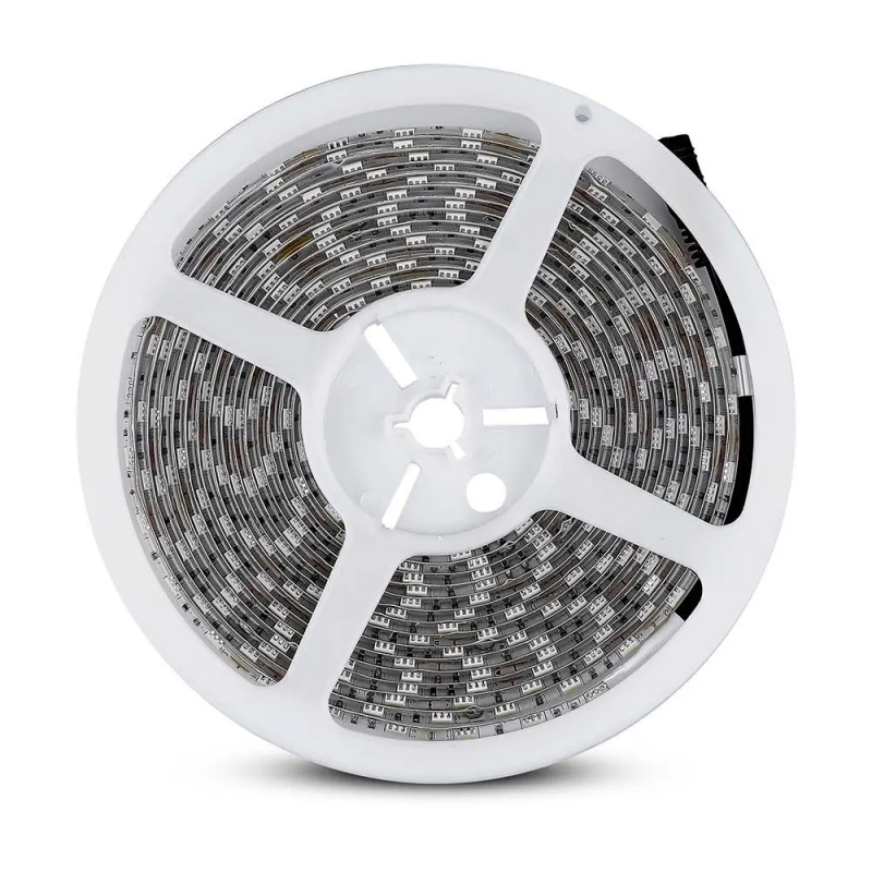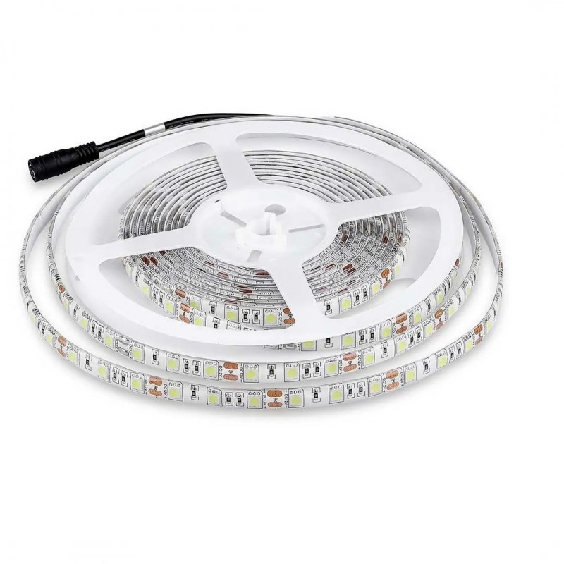 Striscia LED SMD5050 RGB con potenza totale di 35W. Lunghezza bobina: 5m, sezionabile ogni 50mm. 60 LED per metro e potenza di 7W/m. Fascio luminoso di 120°, flusso luminoso di 140lm/m (700lm totali) e rapporto di 20lm/W. IP65. Dimensioni (LxH): 10x2mm.