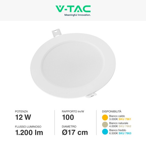 Mini pannello LED potenza di 12W e tecnologia LED SMD.di 360°, flusso luminoso di 1200 lmcon rapporto di 100 lm/W. Corpo realizzato in materiale plastico di colore bianco con copertura in PMMA a finitura opaca.Luce Bianca Fredda 6500K.