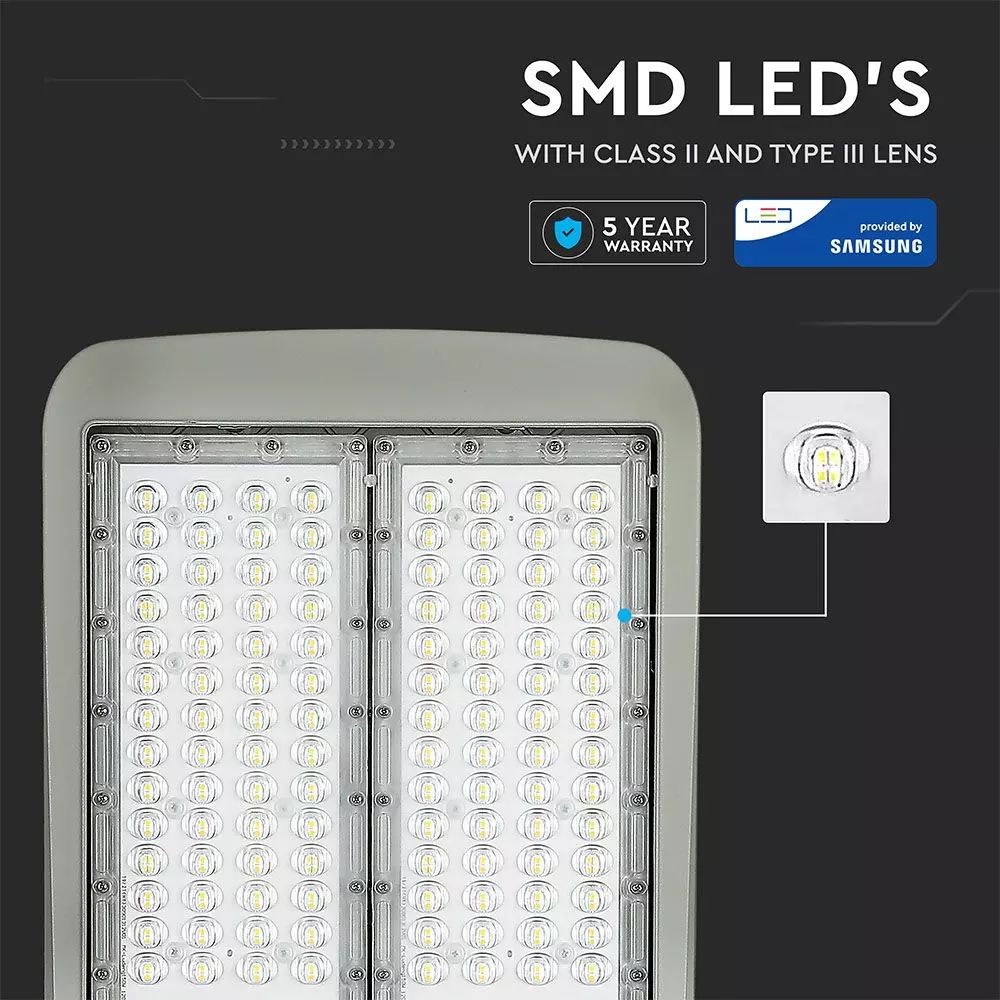 Lampada per l’illuminazione stradale LED V-Tac PRO con potenza di 150W. Realizzata in alluminio pressofuso con parte inferiore in vetro di colore grigio scuro e copertura dei LED trasparenti. LED SMD Chip Samsung con fascio luminoso type 3M (studiato appositamente per l’illuminazione stradale) e flusso luminoso di 21000 lm. Driver dimmerabile Inventronics incluso nel faro con un output di 76-229 Vdc. Questa lampada ad alta luminosità ha un rapporto di 140 lm/W. Grado di protezione IP65 con protezione da sovratensione. Grazie alla predisposizione dell’attacco, è possibile installare questo faro sia in un tubo orizzontale che verticale, con diametro 30-50 mm. Questo lampione stradale è adatto per l’illuminazione esterna di strade, parcheggi, aree commerciali, parchi e piste ciclabili. La moderna illuminazione stradale LED aumenta anche la sicurezza stradale. Un riflettore ad alta definizione fraziona la luce in innumerevoli puntini luminosi privi di abbagliamento, così guidatori e pedoni non vengono abbagliati. Le zone luminose e ben illuminate possono contribuire a ridurre il tasso di incidenti e di criminalità. Oltre agli innumerevoli vantaggi in termini di luminosità e sicurezza stradale, è inoltre possibile sfruttare tutto il potenziale dell’illuminazione LED per ottenere un considerevole risparmio di energia.