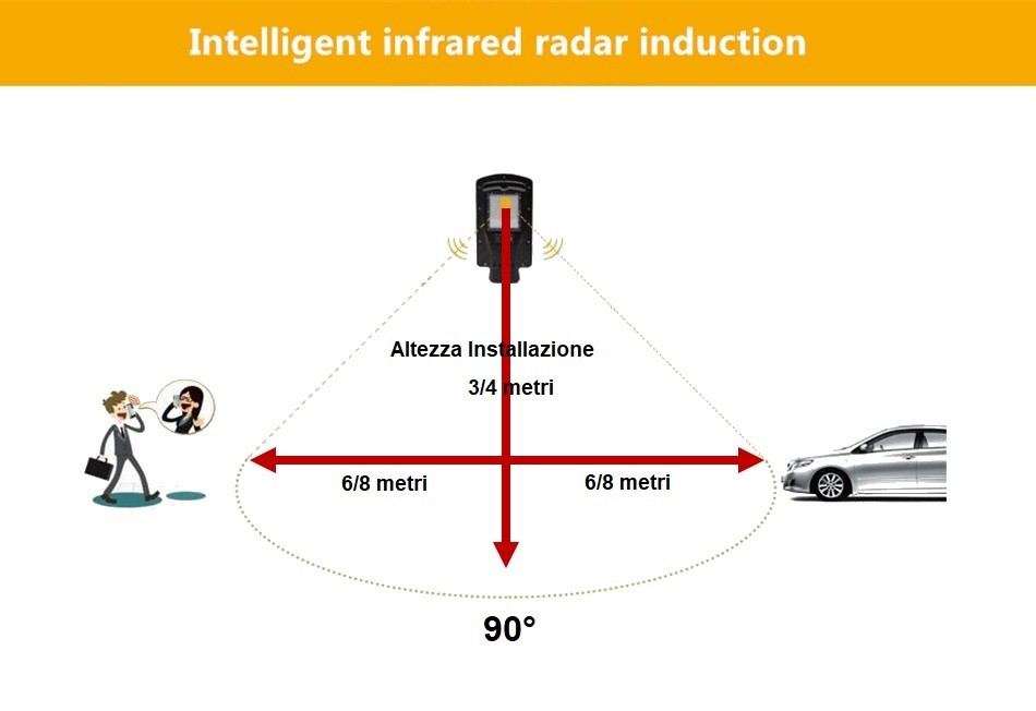 Note: Installare ad almeno 3/4 metri di altezza lasciando una distanza di 6/7 metri tra un lampione e l’altro. Il raggio di rilevamento è di 120°, mentre la distanza di rilevamento del sensore è di 6/8 metri con un ritardo massimo di 20 secondi.