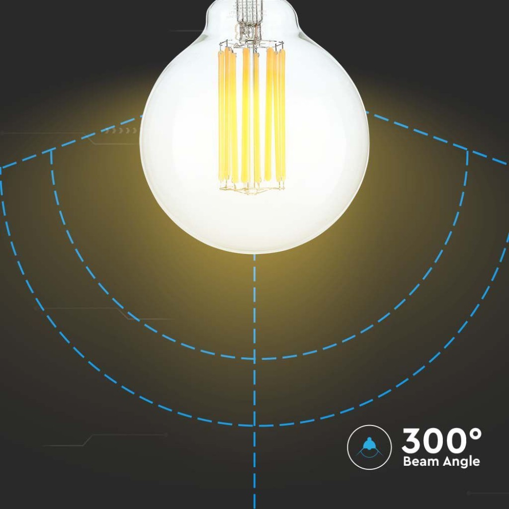 Lampadina LED da 18W con attacco E27 e tecnologia LED Filament. Forma a Globo G95 in vetro trasparente. Fascio luminoso di 300° e flusso luminoso di 2520lm. Alta luminosità e rapporto di 140 lm/W. Luce Bianca Calda 3000K.