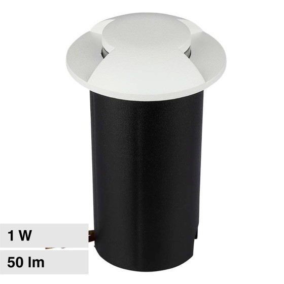 Segnapasso da interramento con potenza di 1W e tecnologia LED SMD. Forma circolare realizzata in alluminio e materiale plastico di colore bianco. Fascio luminoso di 180° e flusso luminoso di 50 lm. Rapporto di 50 lm/W. IP67. Luce Bianca Calda 3000K Ø60x93mm.