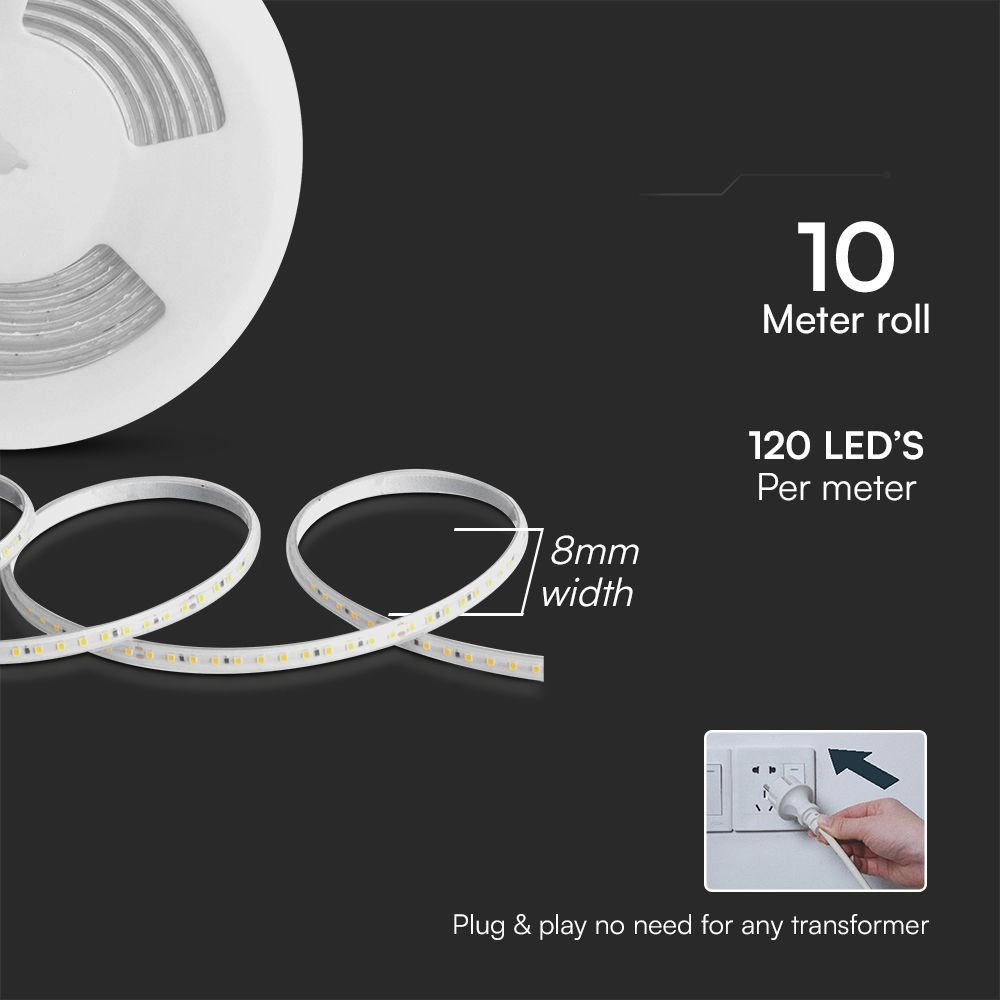 Questa striscia LED funziona direttamente a 220-240V AC, eliminando il rischio di cadute di tensione su lunghe distanze. Il collegamento con spina Schuko consente un’installazione immediata e senza complicazioni. Inoltre, è dotata di un adesivo posteriore per facilitare l’installazione su diverse superfici.