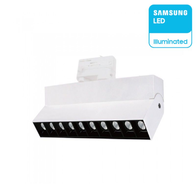 V-Tac PRO LED Linear Track Light VT-431 con potenza di 25W. Corpo in alluminio di colore bianco. Track Light composta da 10 faretti, ognuno con riflettore nero lucido e copertura dei LED trasparente. LED SMD con fascio luminoso di 30°, flusso luminoso di 2000 lm e rapporto di 80 lm/W. Corpo orientabile in senso orizzontale di 360° e testa inclinabile in verticale fino a 90°. Driver integrato. Installazione su binario, ideale per negozi, vetrine, showroom, in sostituzione delle tradizionali track light alogene. Compatibile con binario trifase EU Standard.