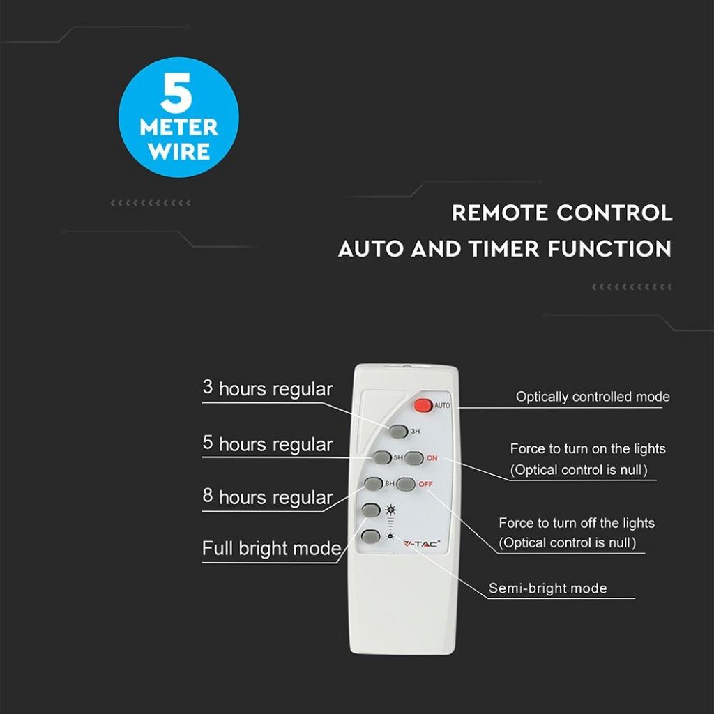 Il pannello fotovoltaico, fornito in dotazione, ha un cavo di ben 5 metri e si collega tramite connettore (2PIN ) stagno al proiettore che internamente dispone di una batteria a litio 3,2V da 5000mAh. La Batteria possiede un autonomia di funzionamento di circa 8 / 24h . La ricarica avviene tramite l’energia solare, che in soli 6/7h consente di ricaricare al massimo lo stato della batteria. Inoltre, grazie al telecomando è possibile accendere e spegnere il faro o impostare tre differenti Timer per lo spegnimento: 3 ore, 5 ore, 8 ore. Il telecomando necessita di 2 Batterie STILO tipo AA (non incluse nella confezione).