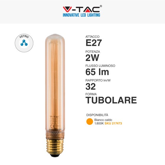 2W LUCE 1800K CALDA SKU 217473 V-TAC Lampadina LED E27 T30 Candela Filamento Ambrato Art