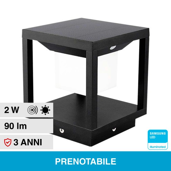 Lampada LED 2W integrato e tecnologia LED Samsung SMD. Fascio luminoso di 120°, flusso luminoso di 90 lm con rapporto di 45 lm/W. IP65. Sensore di movimento e crepuscolare con 2 modalità. Pannello solare incorporato. Luce Bianca Calda 3000K.