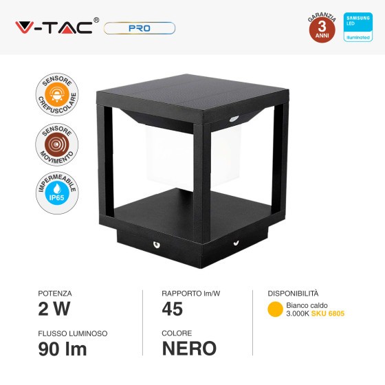 2W LUCE 3000K CALDA V-TAC Lampada Solare LED da terra Quadrata con Sensore di Movimento Colore Nero IP65