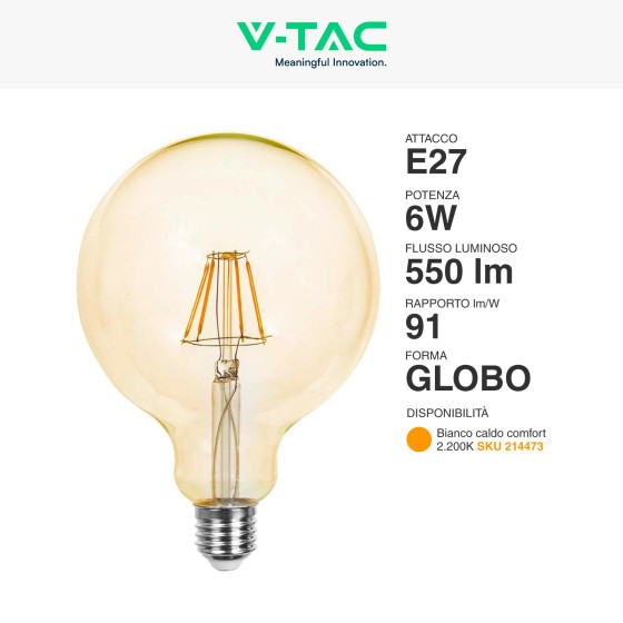 Lampadina LED da 6W con attacco E27 e tecnologia LED Filament. Forma a Globo G125 in vetro e copertura ambrata per un effetto vintage. Fascio luminoso di 300° e flusso luminoso di 550 lm. Rapporto di 91 lm/W. Luce Bianca Calda 2200K. Dimensioni