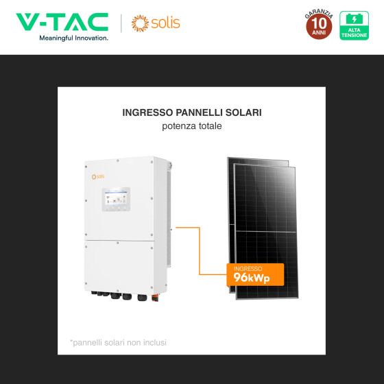 L’Inverter Ibrido Solis di V-TAC SKU 12294 (S6-EH3P50K-H), Trifase Alta Tensione 50kW Quadruplo MPPT ciascuno con doppia stringa, è un dispositivo elettronico che permette di convertire la corrente continua fornita dai pannelli solari fotovoltaici in corrente alternata, con uscita Trifase adatta per il consumo di abitazioni o locali commerciali e industriali.