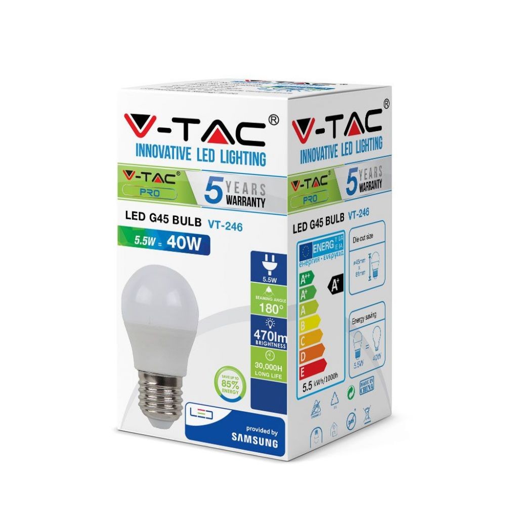 Di seguito maggiori informazioni sul prodotto V-TAC con SKU 174, categoria Lampadine – E27: Lampadina LED V-TAC PRO VT-246 dotata di una potenza di 5,5W e attacco E27. Lampadina con tecnologia LED SMD con chip Samsung, Forma MiniGlobo G45 in materiale termoplastico e copertura opaca. Questo prodotto dispone di un fascio luminoso di 180°, flusso luminoso di 470 lm e un rapporto di 85 lm/W. La potenza di 5,5W è equivalente a 40W di una Lampadina a incandescenza.