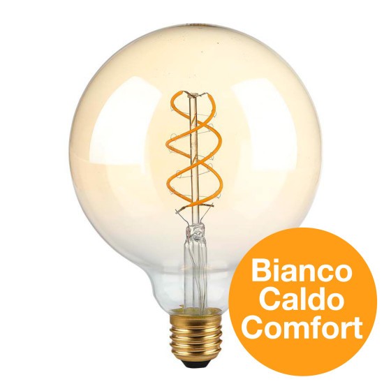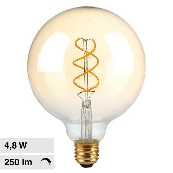 Lampadina LED da 4,8W con attacco E27 e tecnologia LED Filament. Forma a Globo G125 in vetro e copertura ambrata per un effetto vintage. Fascio luminoso di 300° e flusso luminoso di 250 lm. Rapporto di 52 lm/W. Dimmerabile. Luce Bianca Calda 1800K.