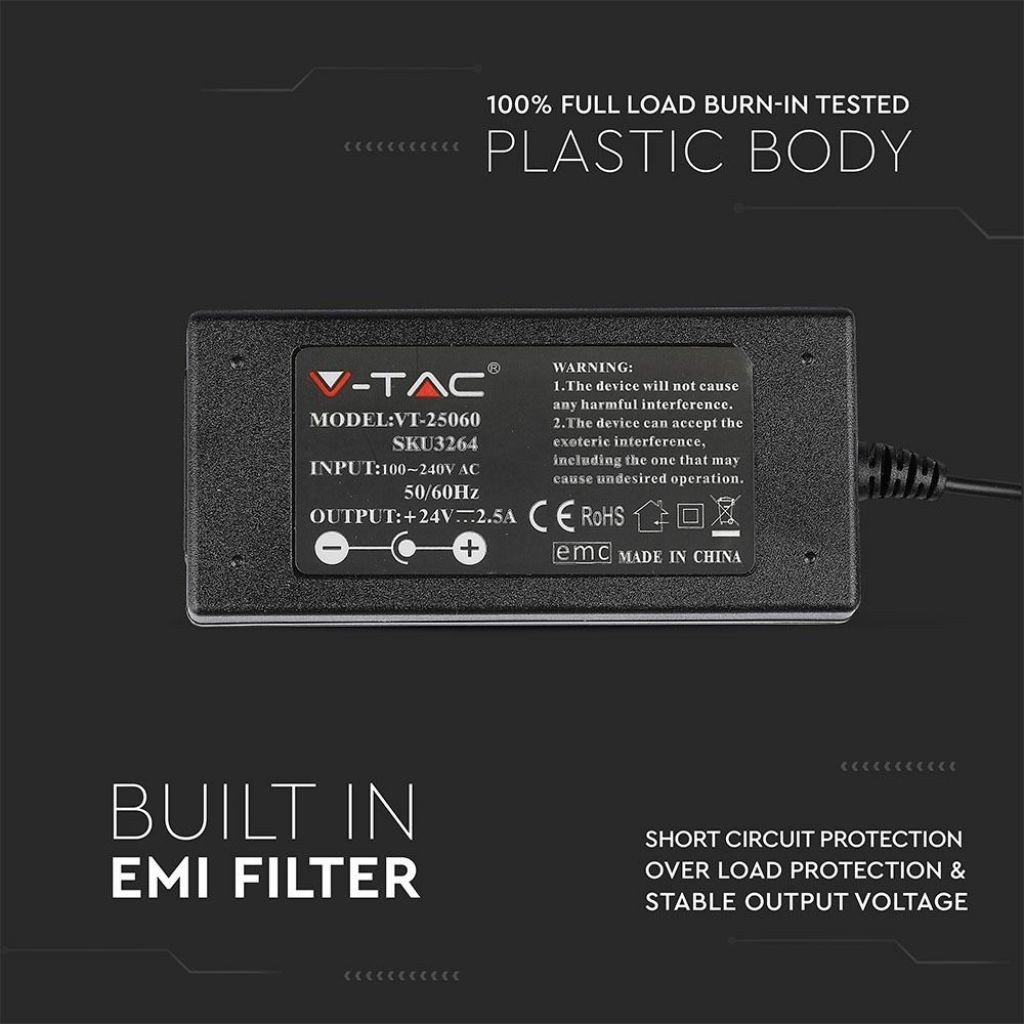 Progettato per essere compatibile con tutte le strisce LED V-TAC e altri dispositivi a 24V, fornisce una tensione di uscita costante che protegge i dispositivi collegati. È certificato CE, RoHS ed EMC, assicurando la conformità agli standard di sicurezza europei.