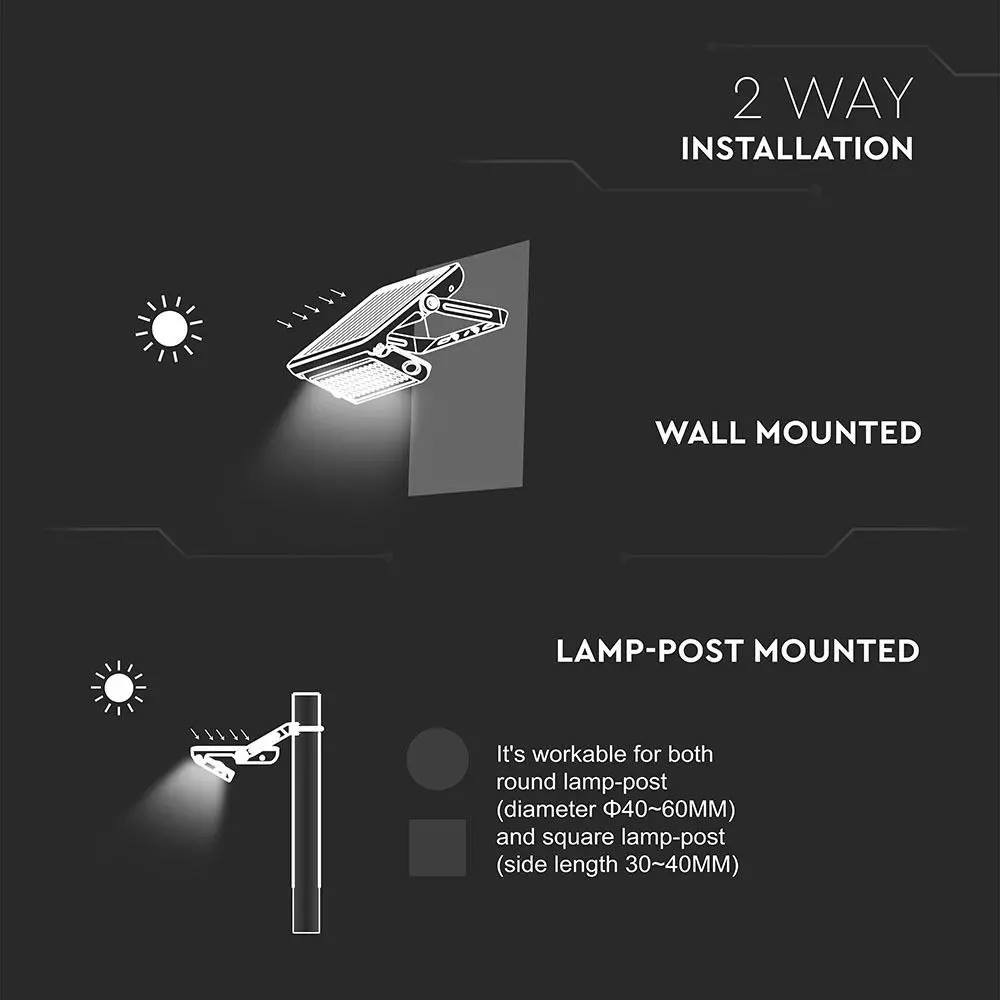 Lampada LED 7W da parete per esterno (Waterproof IP65) con pannello solare, sensore di movimento infrarossi PIR + crepuscolare integrato – Funzione doppia emissione luce tonalità con gradazione Kelvin 4000K. Design moderno ed elegante, struttura in plastica rigida di colore nero V-TAC – SKU 8279