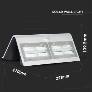 Lampada LED SMD da muro con Fascio luminoso di 120° e flusso luminoso di 800 lm. Alimentato a batteria, con pannello solare, sensore crepuscolare e di movimento. IP65. Dimensioni:270×109,2×221mm.