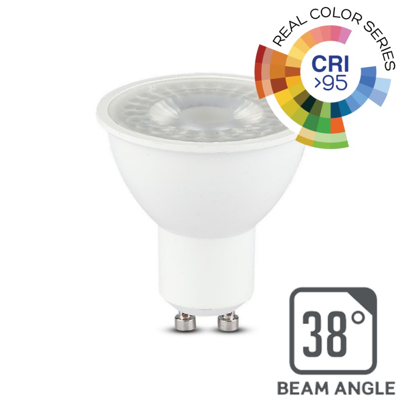 Lampadina LED V-Tac con potenza di 6W e attacco GU10. Forma faretto spotlight in materiale termoplastico bianco. Fascio luminoso di 38°, flusso luminoso di 400 lm e rapporto di 66 lm/W. La potenza di 6W è equivalente a 55W di una lampada a incandescenza. Lampadina con indice di resa cromatica (CRI) >95. Il CRI indica la fedeltà nel riprodurre le diverse gamme cromatiche di una fonte luminosa, più si avvicina al valore 100, più i colori sono brillanti, naturali e fedeli alla realtà.