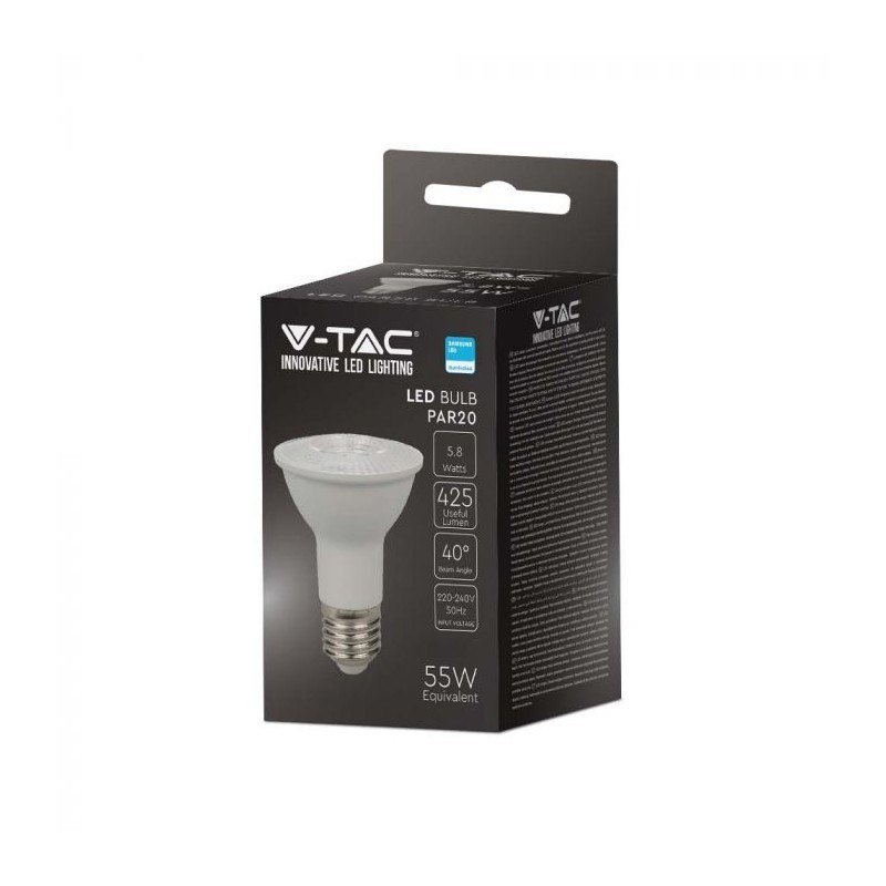 Lampadina LED con attacco E27, tecnologia LED SMD e potenza di 5,8W. PAR Lamp con corpo in plastica bianca e copertura satinata. Fascio luminoso di 40°, flusso luminoso di 425lm e rapporto di 73 lm/W. Luce Bianca Calda 3000K,. Dimensioni: Ø64x84mm.