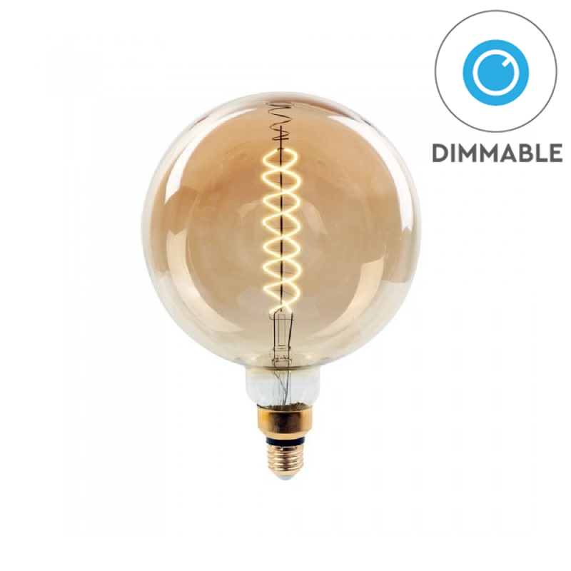 Lampadina LED da 8W con attacco E27 e tecnologia LED Filament. Forma a Globo G200 in vetro e copertura ambrata per un effetto vintage. Fascio luminoso di 300° e flusso luminoso di 500lm con rapporto di 62 lm/W. Dimmerabile. Luce Bianca Calda 1800K.