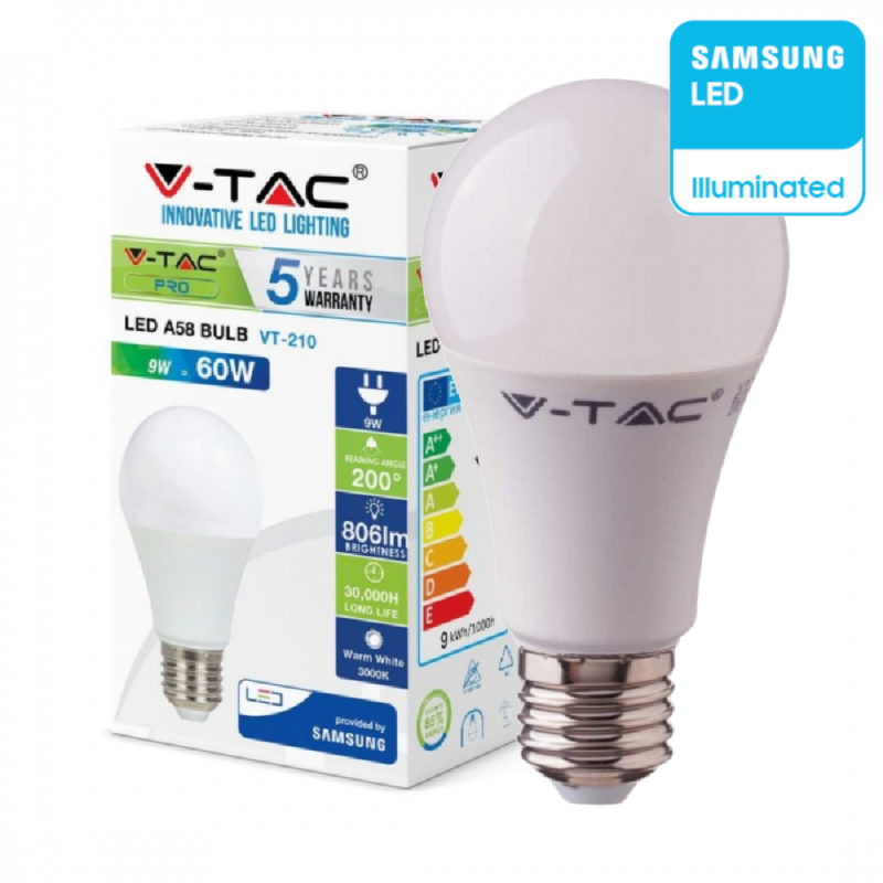 Di seguito maggiori informazioni sul prodotto V-TAC con SKU 229, categoria Lampadine – E27: Lampadina LED V-TAC PRO VT-210 dotata di una potenza di 9W e attacco E27. Lampadina con tecnologia LED SMD con chip Samsung, Forma Bulb A60 in materiale termoplastico e copertura opaca. Questo prodotto dispone di un fascio luminoso di 200°, flusso luminoso di 806 lm e un rapporto di 89 lm/W. La potenza di 9W è equivalente a 60W di una Lampadina ad incandescenza.