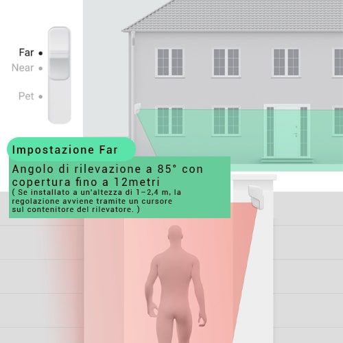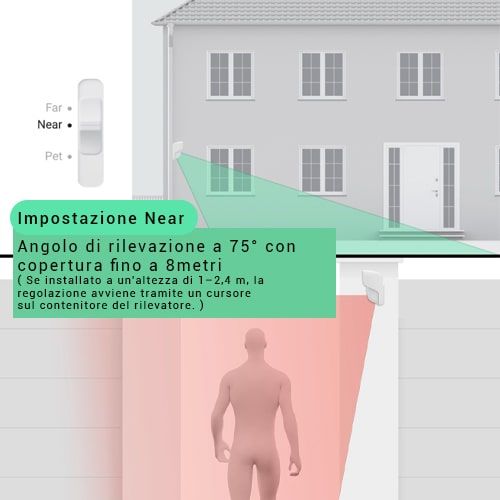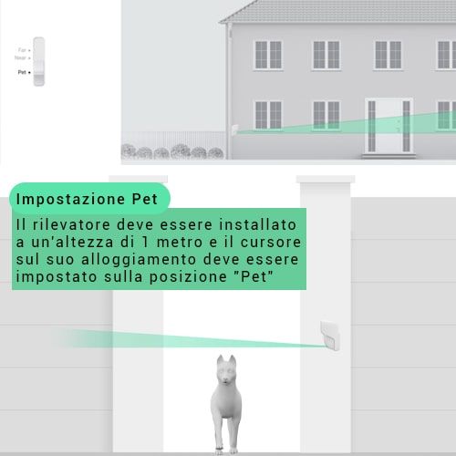 | Configurazione portata di rilevamento | Nel dispositivo (Far: fino a 12 m / Near: fino a 8 m / Pet: anti-pet fino a 12 m) |