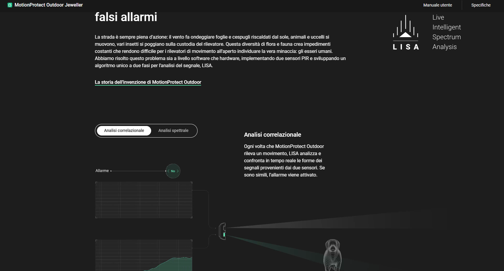 Animali, uccelli o alberi possono causare un falso allarme con il loro movimento. Ma il rilevatore di movimento da esterno MotionProtect Outdoor evita questi falsi allarmi, utilizzando un sistema per il controllo dei segnali con due sensori IR e un algoritmo di analisi LISA a due fasi.