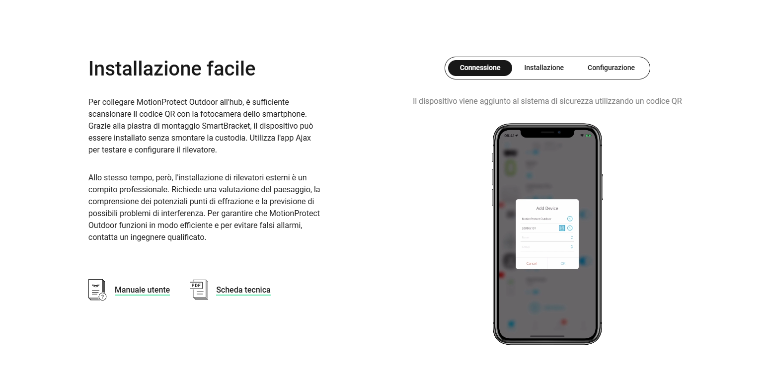 Allo stesso tempo, però, l’installazione di rilevatori esterni è un compito professionale. Richiede una valutazione del paesaggio, la comprensione dei potenziali punti di effrazione e la previsione di possibili problemi di interferenza. Per garantire che MotionProtect Outdoor funzioni in modo efficiente e per evitare falsi allarmi, contatta un ingegnere qualificato.giunto al sistema di sicurezza utilizzando un codice QR