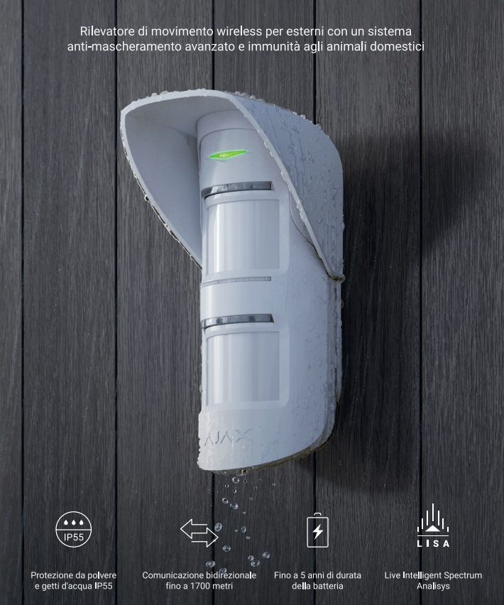 MotionProtect Outdoor si adatta a qualsiasi condizione atmosferica, grazie alla protezione della custodia da polvere e umidità. Il rilevatore wireless per esterni funziona fino a 5 anni con batterie preinstallate. L’intervallo di temperature di funzionamento del rilevatore esterno va da -25°C a +60°C, l’umidità massima ammessa per un corretto funzionamento è del 95%.