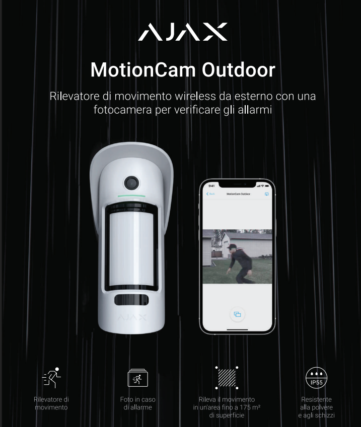 MotionCam Outdoor è dotato di una telecamera per valutare rapidamente la situazione all’interno della struttura protetta. Il rilevatore scatta una serie automatica di foto non appena identifica un’intrusione nell’area protetta. La serie di foto viene visualizzata in un’animazione che permette di vedere la dinamica dell’evolversi della situazione. MotionCam Outdoor PhOD può scattare una serie di foto su richiesta di un utente dall’applicazione mobile Ajax, indipendentemente dalla modalità di sicurezza. Inoltre, può scattare automaticamente le foto per programmazione, per scenario, per inserimento/disinserimento, o quando un altro rilevatore del sistema viene attivato.