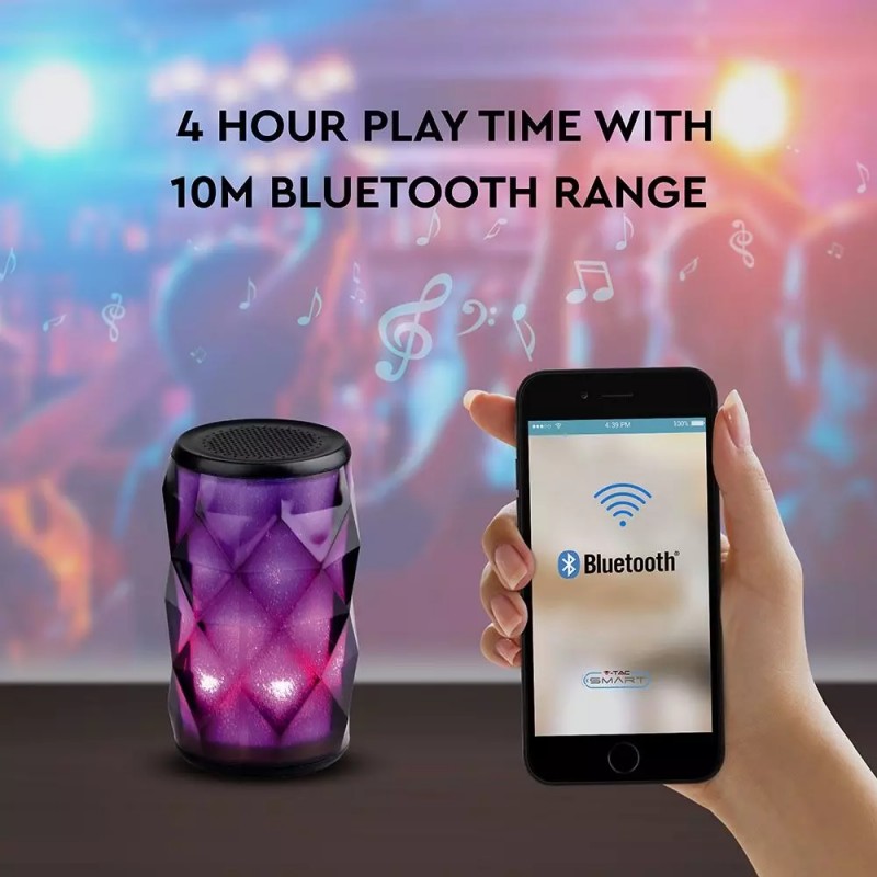 Di seguito maggiori informazioni sul prodotto V-TAC con SKU 7723, categoria Accessori digitali – Altoparlanti: potenza VT-6211 Speaker portatile con connessione Bluetooth e LED RGB Il prodotto è realizzato in materiale plastico trasparente effetto affumicato Design dalla forma sferica che si caratterizza per la superficie lucida modellata in stile poligonale tridimensionale Nel retro si trova la pulsantiera Il prodotto può essere appoggiato su qualsiasi superficie piana, anche grazie al materiale antiscivolo posto alla base
