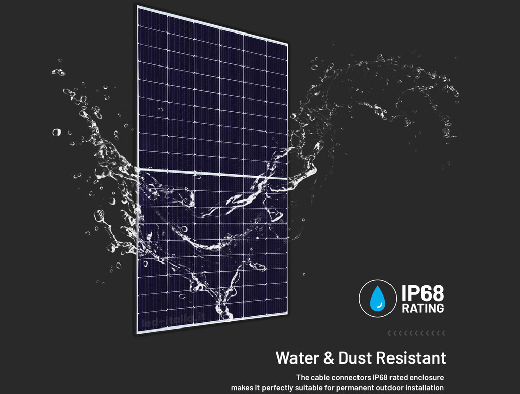 Certificato TÜV NORD, con resistenza a vento/neve pari a 2400Pa/5400Pa e alta resistenza ad ammoniaca e nebbia salina. Il pannello è dotato di scatola di giunzione IP68, 2 cavi di uscita da 300mm (±30cm) 4mm² con connettore compatibile MC4, e telaio in alluminio anodizzato nero.