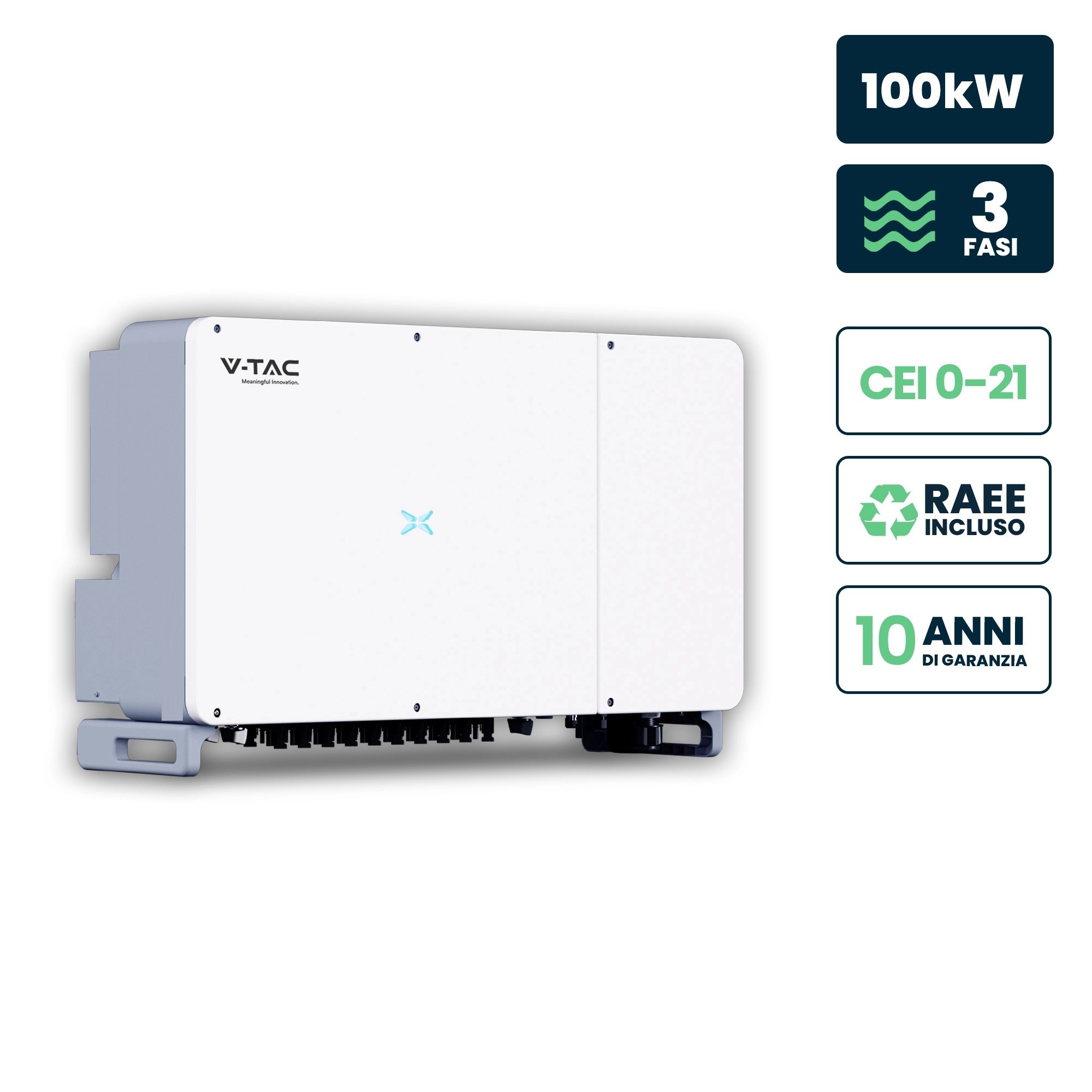 Inverter on grid per pannelli solari di sistemi industriali. Potenza di 100kW e connettore standard RS485. Predisposto per l’installazione a parete. Grado di protezione IP66 per uso esterno. Sistema trifase ad alta efficienza MPPT (99,9%). Da collegare tra i pannelli fotovoltaici ed il contatore. Certificato di conformità CEI 0-21 e CEI 0-16. Datalogger per monitoraggio impianto e cavi di connessione inclusi. Dimensioni: 1050x660x330mm.