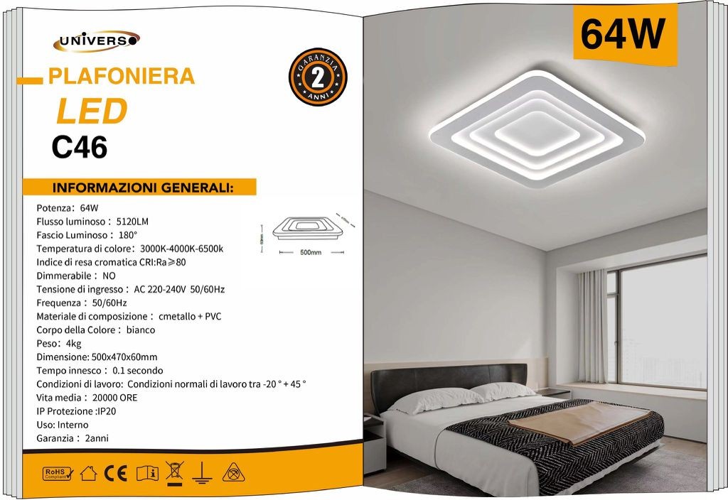 - DIMMERABILE. Fascio luminoso: 180° Materiale di composizione: metallo+acrilico+PVC Colore prodotto: bianco e grigio chiaro. Tempo di innesco: 0.1 secondi Grado di protezione: IP20 Dimensioni Lunghezza: 500 mm Larghezza: 470 mm Spessore: 60 mm Luce PESO 4 KG