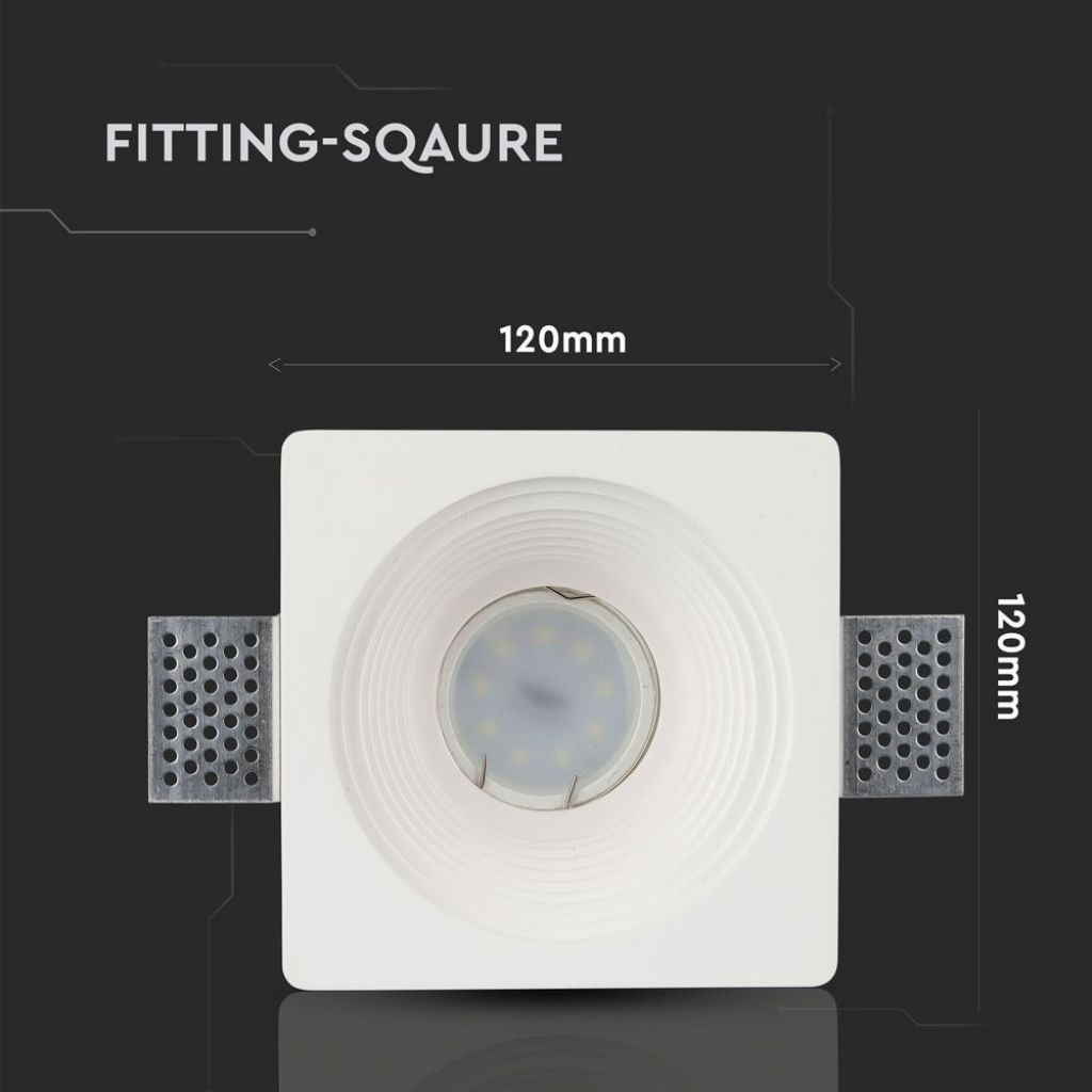Supporto porta faretto quadrato da incasso in gesso colore bianco con parte interna di forma rotonda. Anello per il bloccaggio della lampadina e portafaretto GU10 incluso. Dimensioni:121x121x64mm.