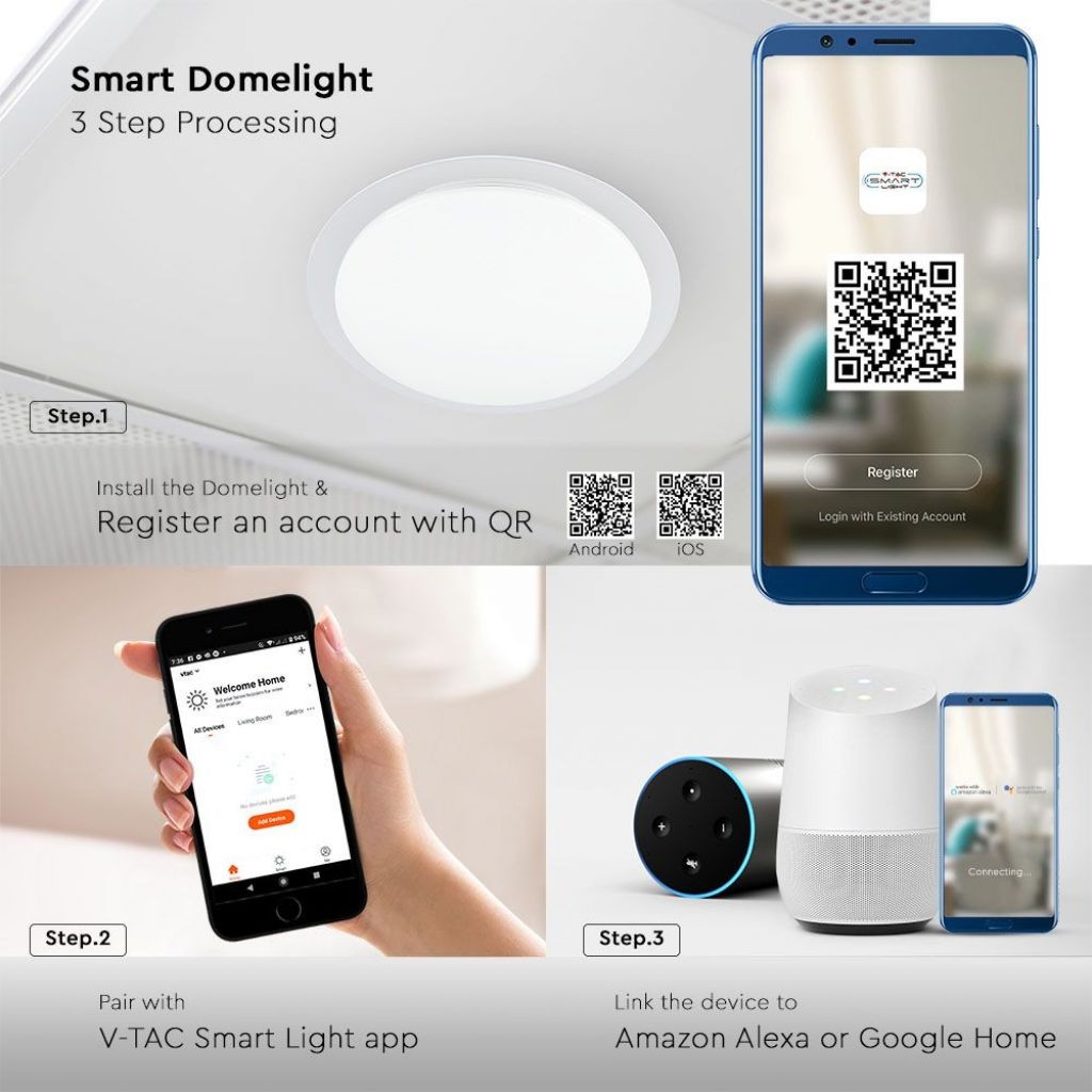 La particolarità di questa plafoniera è quella di incorporare, all’interno di un unico prodotto, tante diverse forme di illuminazione. Riesce a riprodurre vari tipi di luce bianca, uniti al sistema di selezione dell’intensità luminosa (dimmer). Si distingue per la possibilità di controllarla tramite smartphone, sfruttando la rete Wi-Fi di casa da 2,4GHz. Tramite apposita App V-Tac Smart Light (per iOS e Android) è possibile interagire con uno o più dispositivi connessi, con la possibilità di creare anche gruppi di lampadine: utile per esempio per controllare le luci delle varie stanze della propria casa.