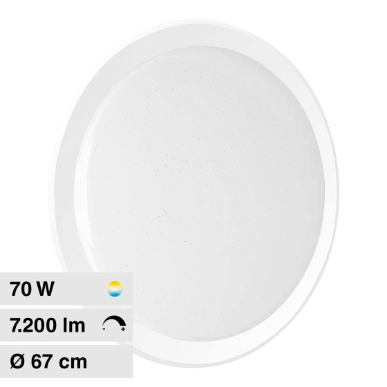 Plafoniera LED tra 36W e 72W LED SMD. Fascio luminoso di 360° a 7200 lm. a 100 lm/W. CCT 3in1 settabile a: Luce Bianca Calda 3000K, Naturale 4000K e Fredda 6500K. Dimmerabile tramite telecomando incluso. Driver incorporato. Dimensioni: Ø670x80mm.