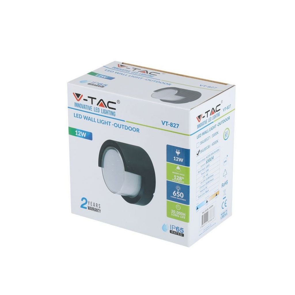 SKU 218538 VT-827 V-TAC Lampada LED da Muro Rotonda 12W con Diffusore Semicoperto Colore Nero 4000K IP65