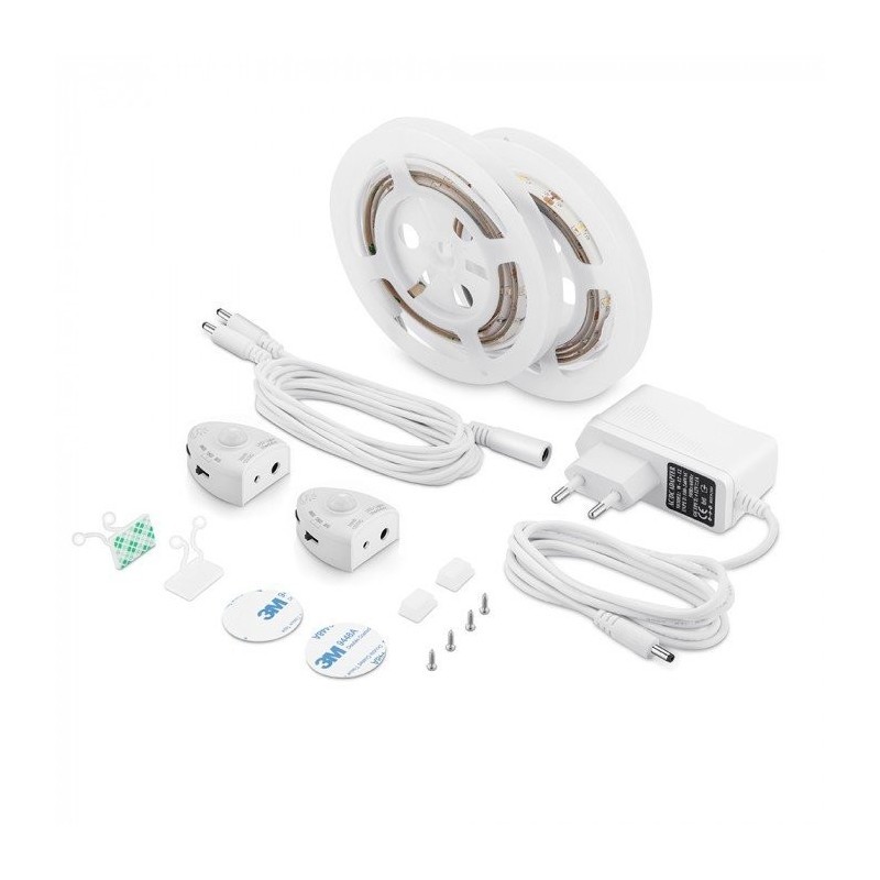 Kit completo con: 2 strisce con 36 LED, 2 sensori di movimento (30-130-380s), alimentatore con spina a rete elettrica. Potenza di 2,8W al metro per striscia. Flusso luminoso: 260lm per striscia. Luce Bianca Calda 3000KLunghezza striscia:1200mm