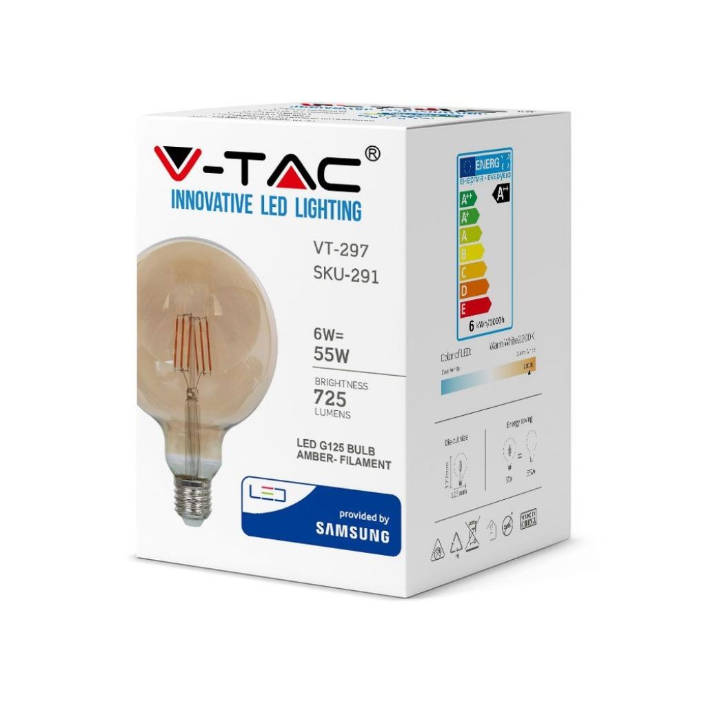 SKU 291 VT-297 V-TAC PRO Lampadina LED Chip Samsung E27 6W G125 Filamento Ambrato 2200K