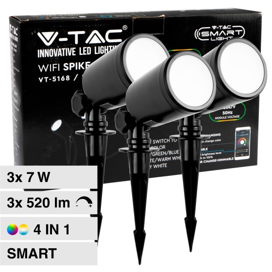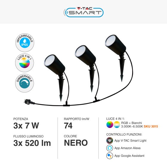 Faretto LED da giardino con potenza di 3x7W. luminoso di 70°, flusso luminoso di 3×520 lm e rapporto di 74 lm/W. Dimmerabile e controllabile tramite app V-Tac Smart Light. Compatibile con Amazon Alexa e Google Assistant. IP65 per uso esterno Luce RGB+W.