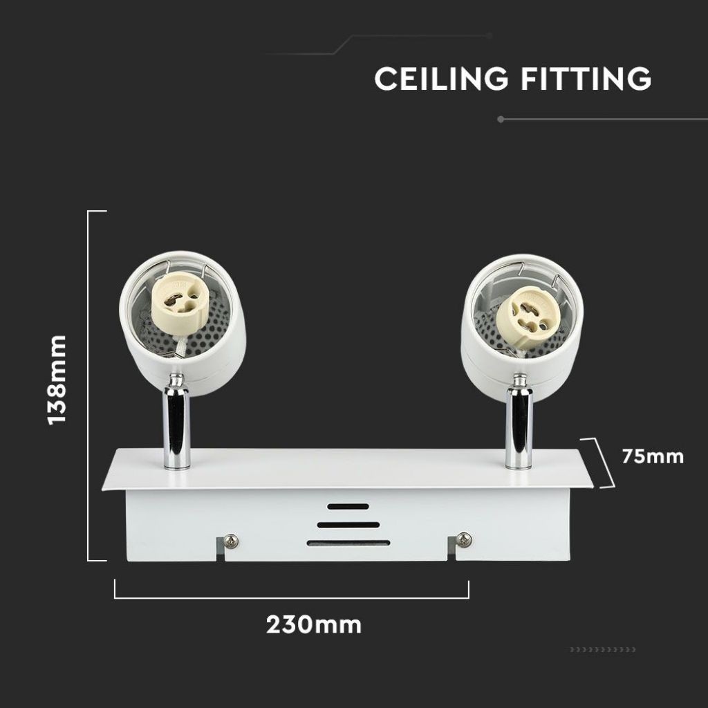 Supporto porta faretto da incasso in metallo di colore bianco per 2 lampadine con attacco GU10. Parte superiore ad incasso, parte inferiore a vista. Anelli orientabili di 360° in orizzontale e 90° in verticale. Portalampade incluso. Dimensioni: 230 x 75 x 138 mm.