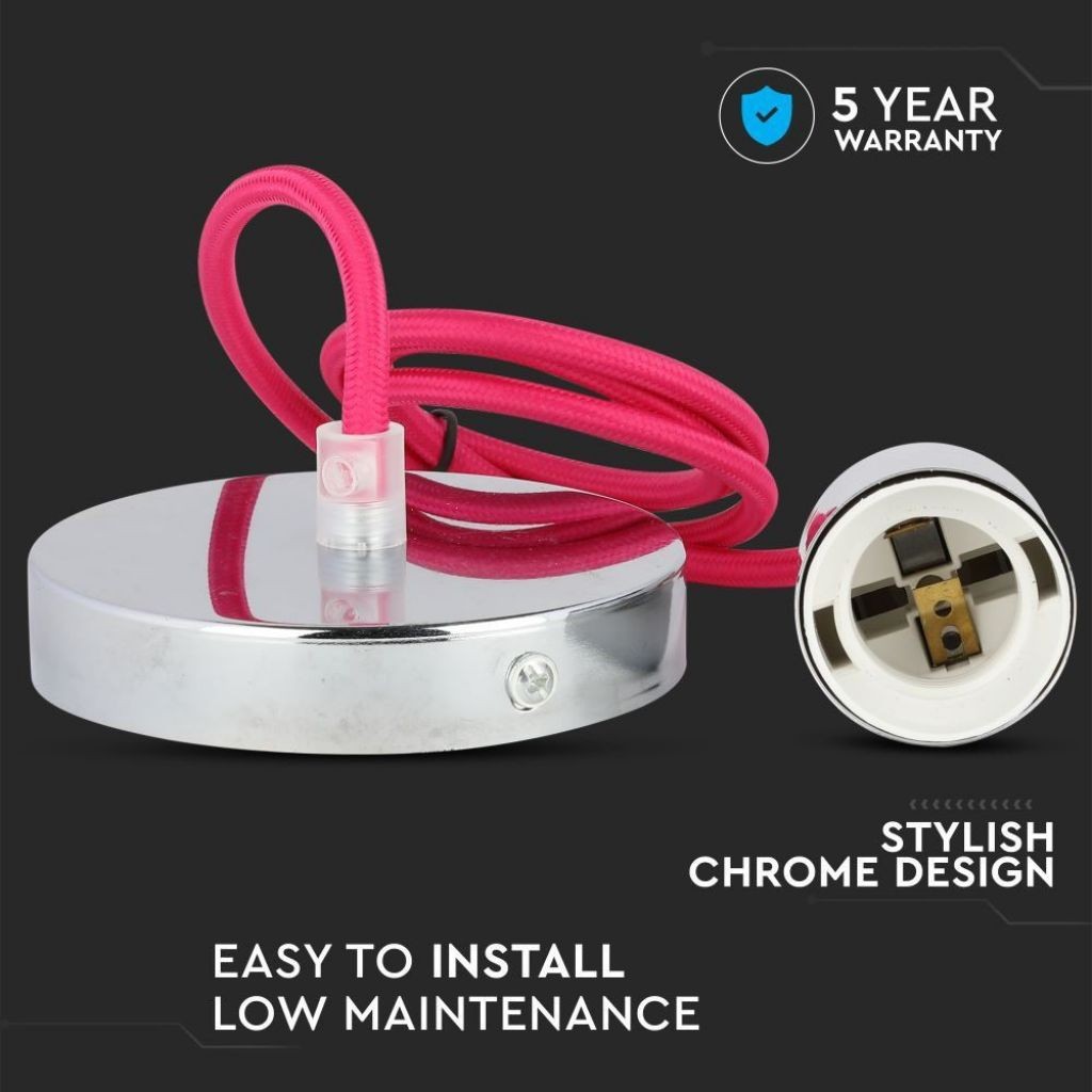 SKU 3792 VT-7338-RR V-TAC Lampadario LED a Cilindro in Metallo con Portalampada E27 (Max 60W) Colore Cromato e Cavo Fucsia